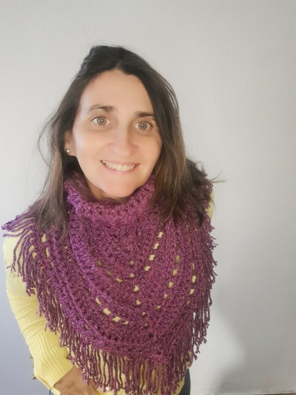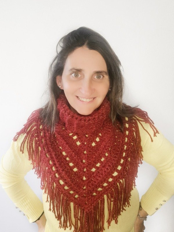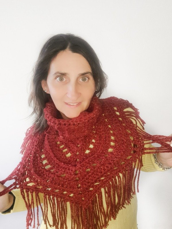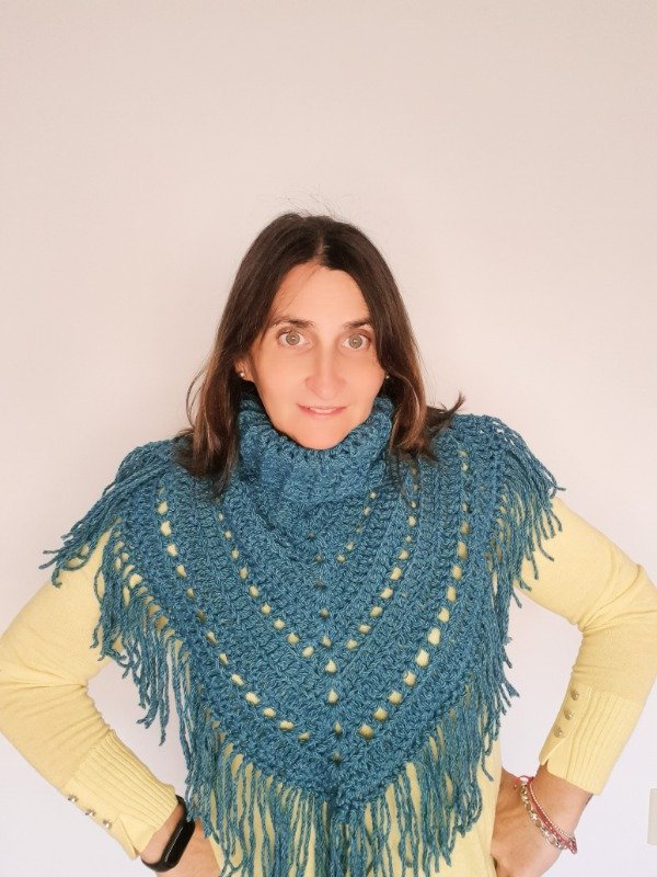 Un diseño original que combina la comodidad de un cuello con la elegancia de un mini poncho. Se teje de una sola pieza y se completa con flecos que le dan movimiento y estilo.